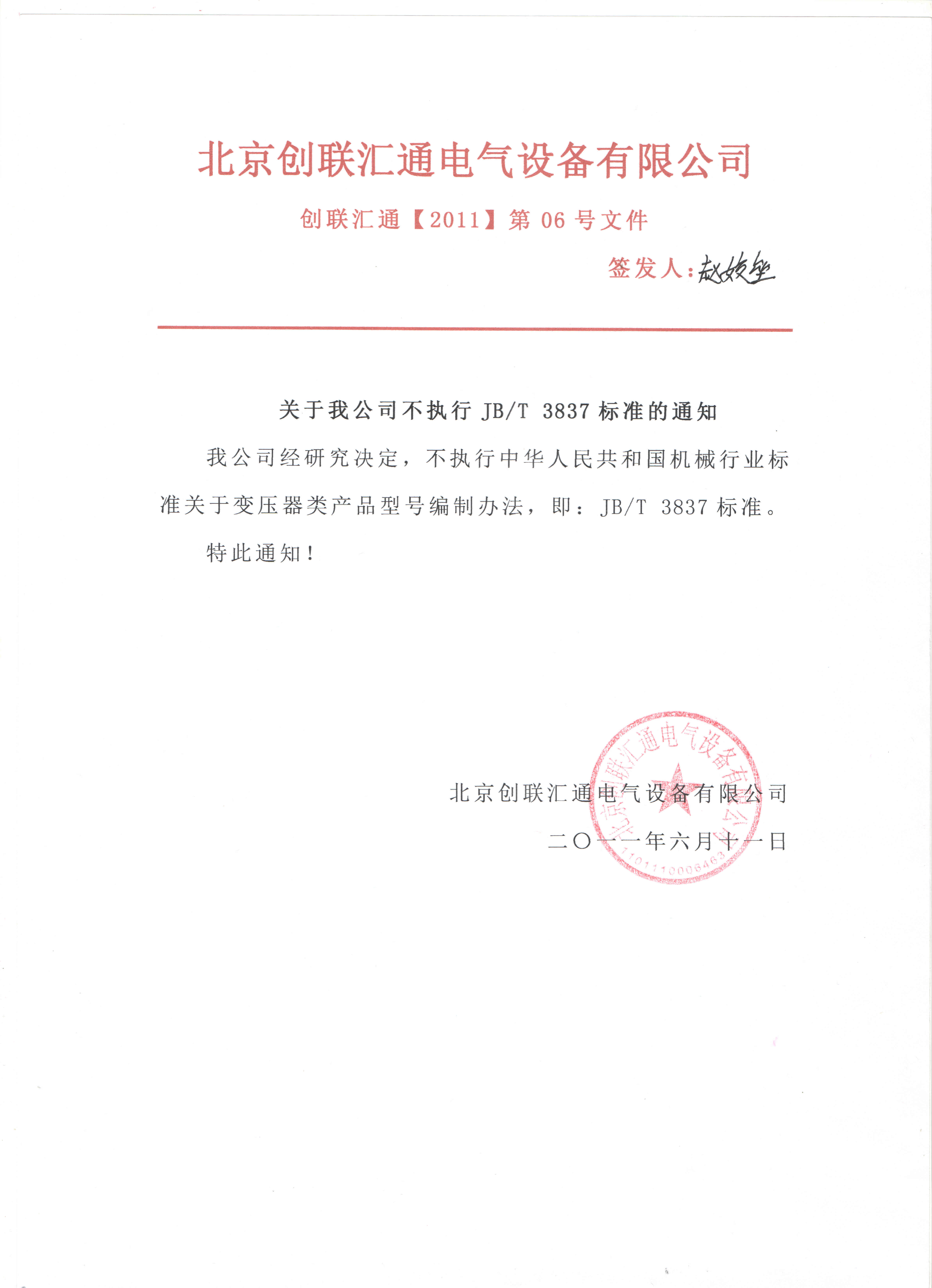 我公司不執(zhí)行JB/T 3837標(biāo)準(zhǔn)的通知